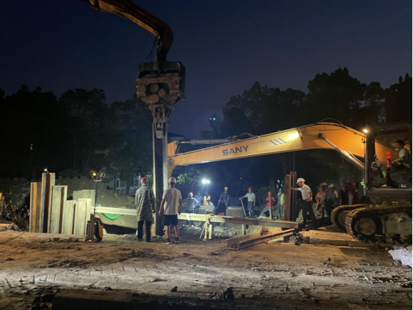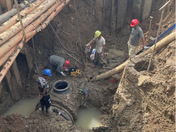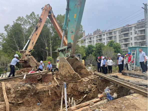 晚上9點,公司第一時間派出10余名搶修人員迅速到場關閘止水,三水廠暫停供水。與此同時,技術人員、施工人員和設備設施“跑步前進”、同步到場,對破損溢水點進行邊開挖、邊診斷。由于情況復雜,晚上24點,3臺大型挖機、樁機進場,20余人到場增援,清理作業面。市政府組織市住建局、澴川國投、供電公司、燃氣公司即刻組成技術專班,會同公司技術人員和一線工人現場制定搶修方案。