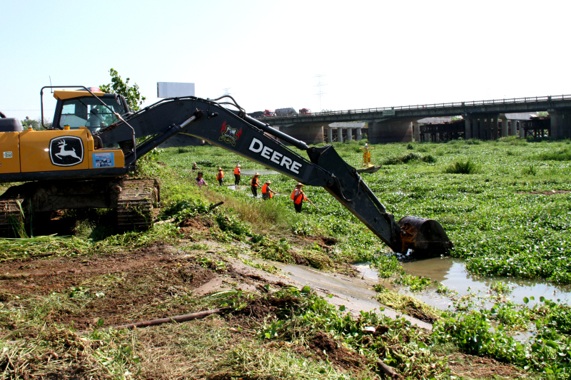 在淪河備用水源地保護(hù)區(qū),由河長(zhǎng)辦和屬地政府組織的清剿隊(duì)已全面進(jìn)場(chǎng),清除作業(yè)正在緊張進(jìn)行中。由于水葫蘆根系交錯(cuò),在水面上密織在一起,牽一發(fā)需動(dòng)全身,常規(guī)的清除方式效率低下。為加快清除進(jìn)度,清剿隊(duì)采取機(jī)械與人工共同作業(yè)、分而治之的方式,即由工作人員先駕船將成片的水葫蘆根系分割打散,切塊后推往岸邊;到近岸處再用機(jī)械反鏟上岸,堆集碾壓暴曬后,裝運(yùn)到垃圾壓縮站,避免水葫蘆枯死腐敗對(duì)水源造成二次污染,確保“斬草除根”,恢復(fù)河道生態(tài)平衡。
