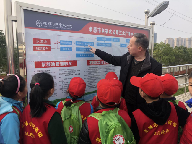 “我們城區(qū)的生活用水來自漢江,大家看看現(xiàn)在水池中水的顏色,我們接著往下參觀……”在公司三水廠工作人員的帶領(lǐng)和介紹下,小記者們看到了處理前的原水。由于他們大多是第一次參觀自來水廠,對(duì)每一步工序、每一處管道、每一種儀器都充滿好奇。他們有的在不停追問,仔細(xì)探究水處理過程中的每一點(diǎn)細(xì)微變化;有的認(rèn)真做著記錄,若有所思,與家長(zhǎng)和同學(xué)進(jìn)行探討。