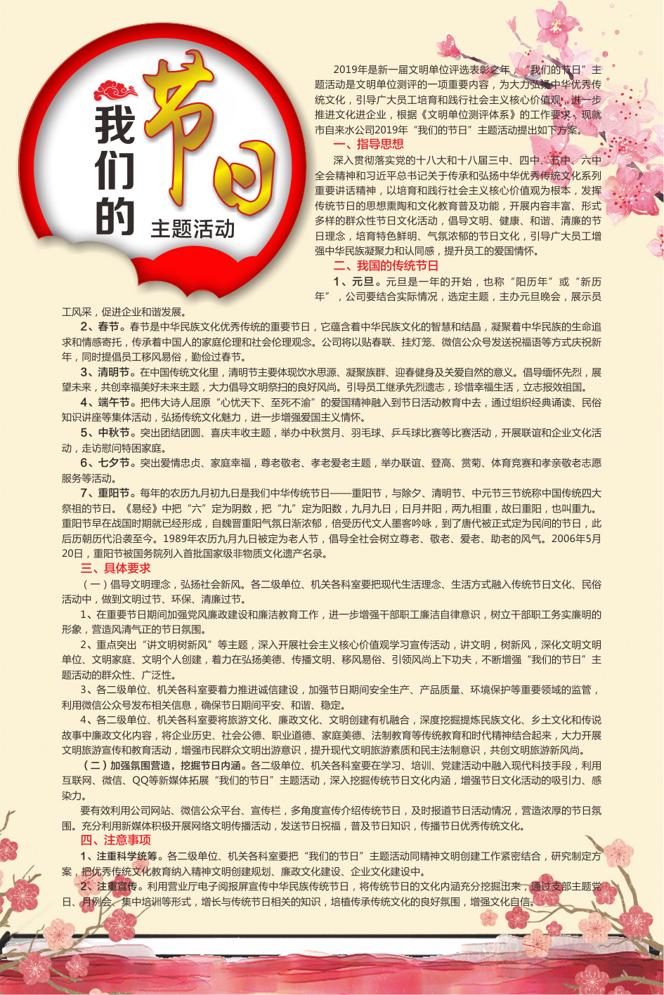 2019年是新一屆文明單位評(píng)選表彰之年,“我們的節(jié)日”主題活動(dòng)是文明單位測(cè)評(píng)的一項(xiàng)重要內(nèi)容,為大力弘揚(yáng)中華優(yōu)秀傳統(tǒng)文化,引導(dǎo)廣大員工培育和踐行社會(huì)主義核心價(jià)值觀,進(jìn)一步推進(jìn)文化進(jìn)企業(yè),根據(jù)《文明單位測(cè)評(píng)體系》的工作要求,現(xiàn)就市自來水公司2019年“我們的節(jié)日”主題活動(dòng)提出如下方案。